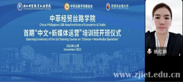 张红阳向中菲经贸丝路学院首期“中文+新媒体运营”培训班的顺利开班表示祝贺,并充分肯定了两校为组织本次培训所做的努力。她指出,近年来,越来越多的菲律宾学生热衷于中文、新媒体运营、电子商务等专业的学习,希望这次活动能够进一步促进两校交流与合作,增进学习,深化友谊,促进中菲民心相通。